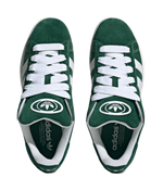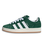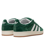 O adidas Campus 00s Dark Green Cloud White apresenta um esquema de cores em verde escuro, branco nuvem e branco sujo.