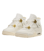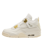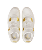 Os Air Jordan 4 'Sail Metallic Gold' apresentam um topo em pele premium branca com painéis de malha a condizer, criando um visual incrivelmente limpo e versátil. As coroas dos atacadores de plástico são cobertas com apontamentos em dourado metálico chamativo, com branding subtil da Jumpman na língua e no calcanhar. O amortecimento Air visível está no calcanhar da entressola, enquanto uma sola de borracha em tom sail completa este esquema de cores luxuoso.