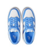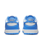 O cabedal do Nike Dunk Low UNC 2021 (GS) é confeccionado em couro branco liso, com perfurações na caixa dos dedos para aumentar a circulação de ar ao redor do pé. A base branca do sapato é contrastada por sobreposições em University Blue; o University Blue também é a cor usada no Swoosh, calcanhar e etiqueta do calcanhar, onde o nome da marca Nike é bordado em branco. "Nike" também aparece em University Blue na língua levemente acolchoada. O tênis é completado por uma entressola de borracha branca sustentada por uma sola exterior em University Blue.